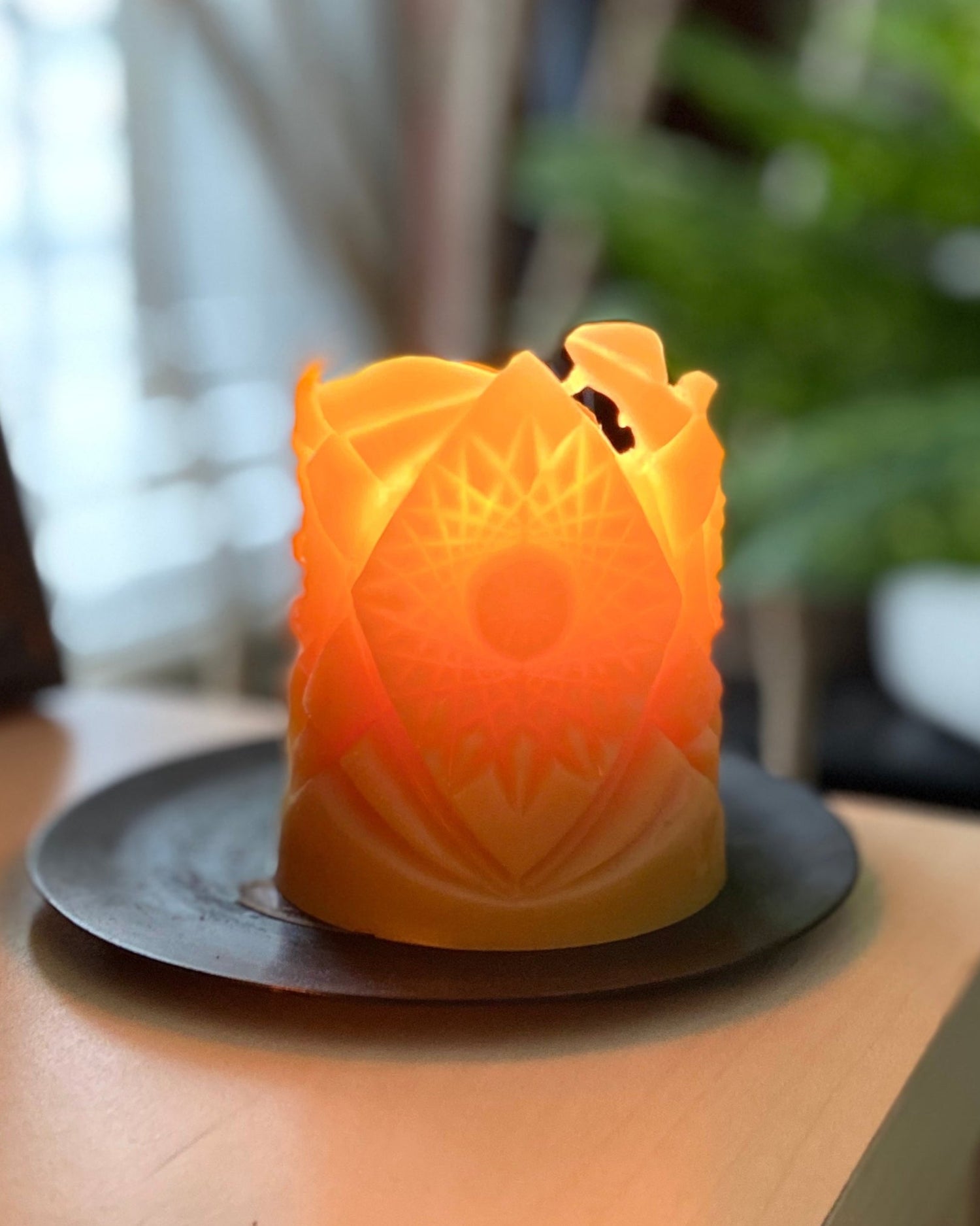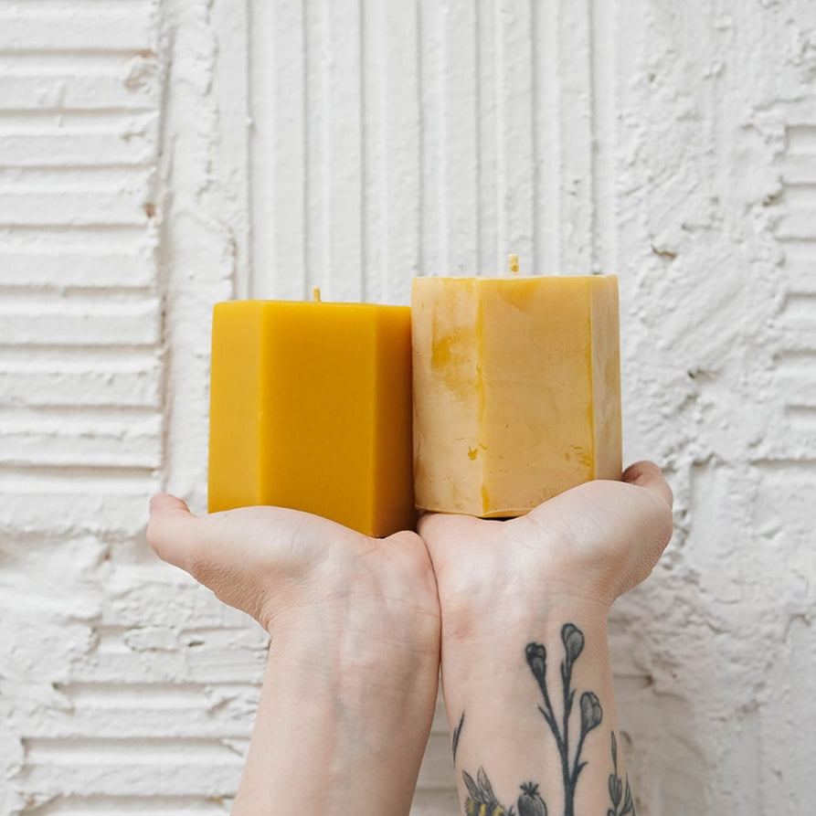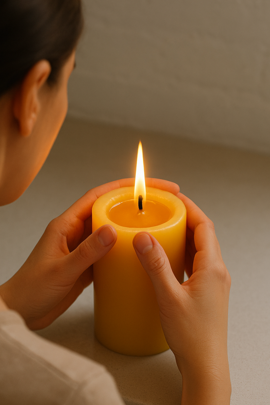 Hugging your beeswax pillar candle involves gently pressing the softened walls of the candle into the flame. This technique ensures that the wax melts evenly, extending the life of your candle.