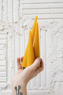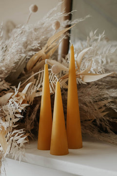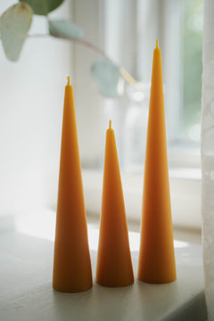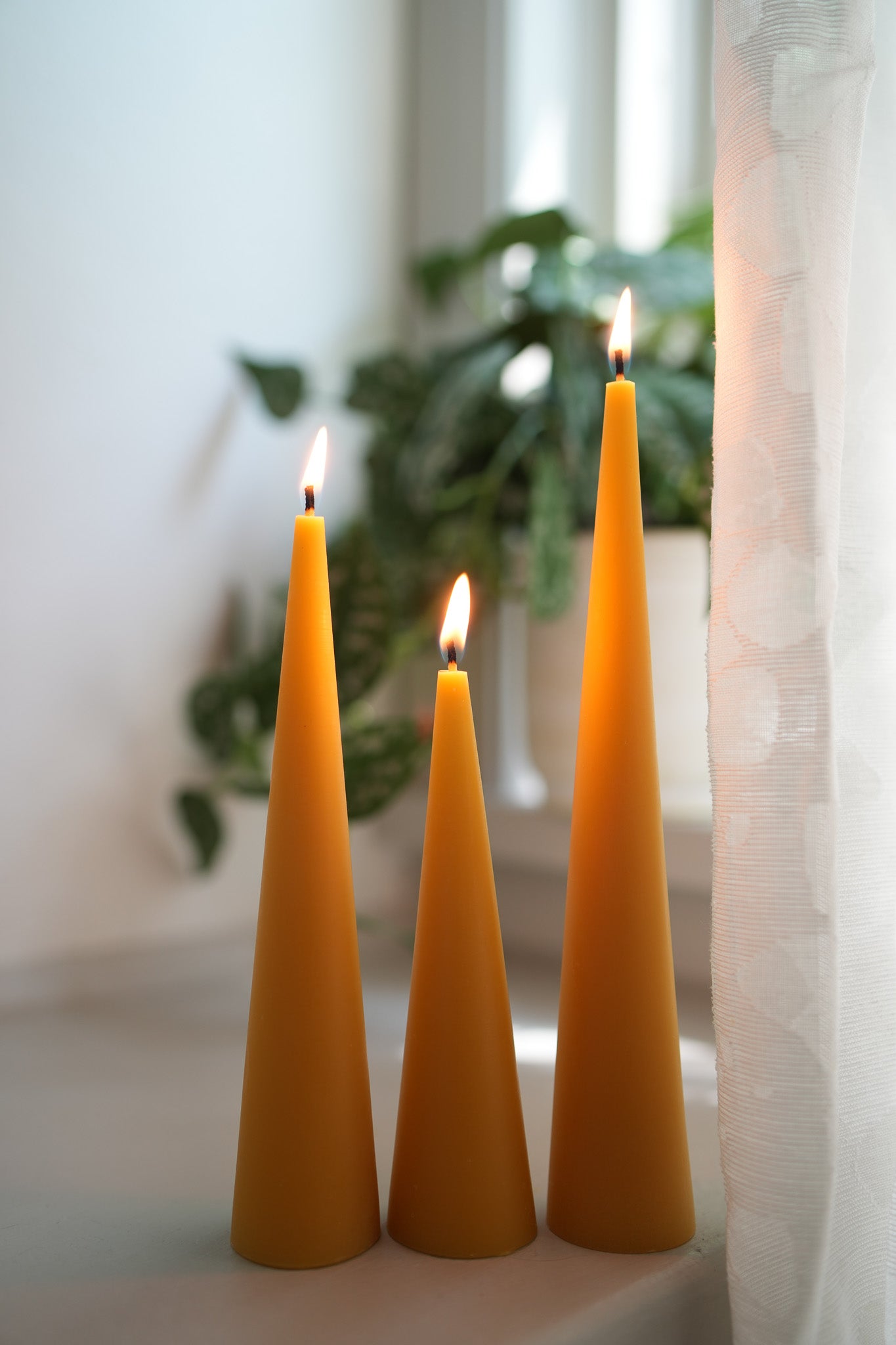 A sleek take on free-standing tapers. These coned candles come as a set of three varying sizes. 100% pure beeswax; soot free and dripless when burned in a draft-free environment.