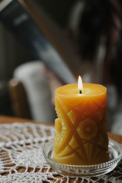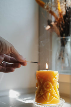 Hugging your beeswax pillar candle involves gently pressing the softened walls of the candle into the flame. This technique ensures that the wax melts evenly, extending the life of your candle. Here’s how to do it: