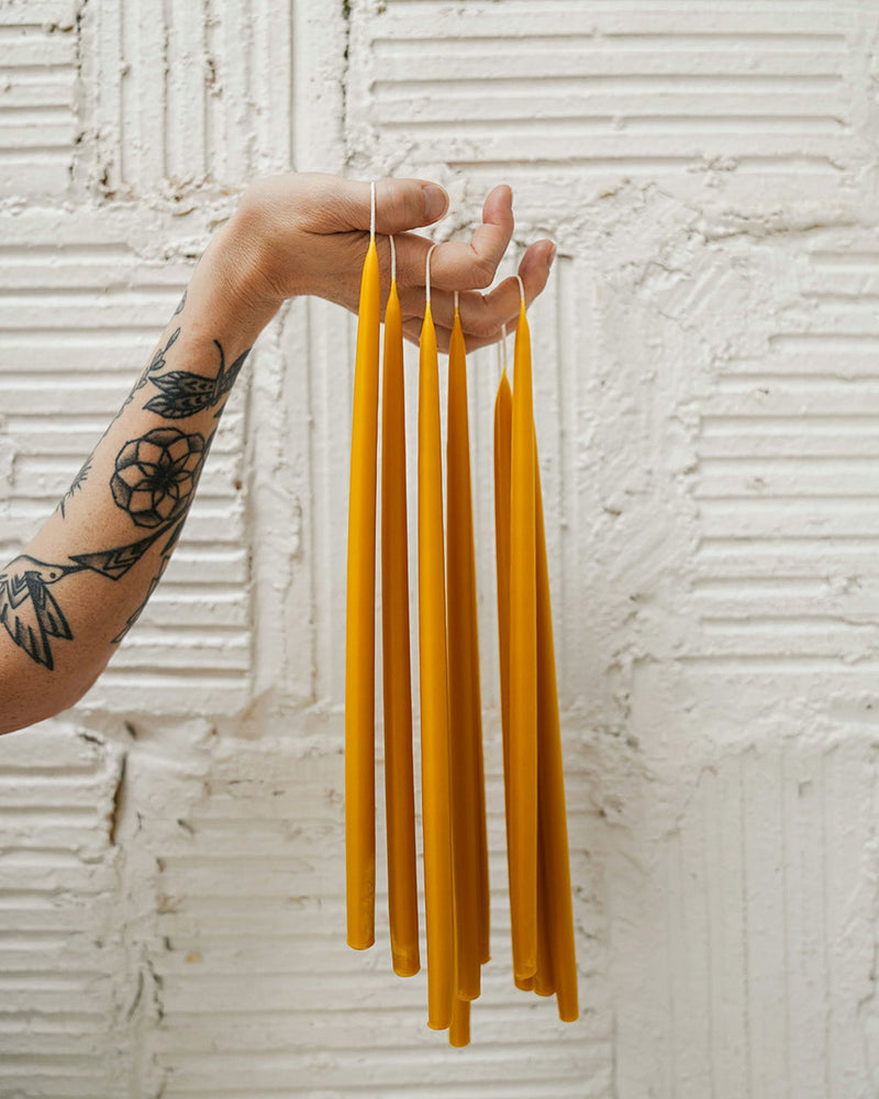 Every Slow Burn candle is made by hand out of the home studio of our founder, Sara Wait, in St. Paul, MN, using 100% pure beeswax sourced from local, family-run apiaries. The wax is triple-filtered for purity, then poured with intention into beautifully curated molds or hand dipped with care. Each candle is designed to burn cleanly and slowly, reflecting Slow Burn’s deep commitment to sustainability, artistry, and exceptional quality.